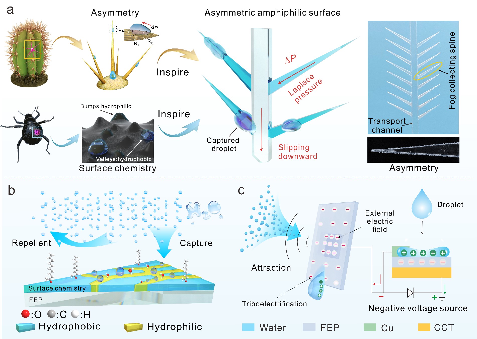 轻工技术与工程专业2021级博士生张松等人从仙人掌刺和甲虫翅翘结构获得灵感,构造了双重仿生结构以实现液滴快速凝结和去除。首次揭示了水收集表面与液滴之间的界面电荷相互作用,并将其应用于大气水收集,实现了前所未有的极高水收集效率。相关研究成果于2022年7月18日以题为“Bioinspired asymmetric amphiphilic surface for triboelectric enhanced efficient water harvesting”在线发表于《Nature Communications》。论文链接//doi-org-s.vpn.wnacg8.com:8118/10.1038/s41467-022-31987-w