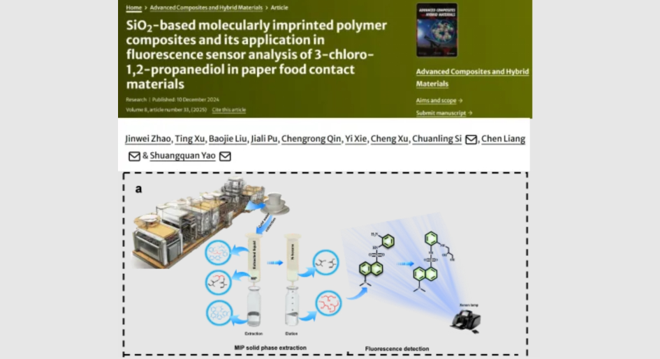 王双飞院士团队覃程荣教授课题组与天津科技大学司传领教授团队合作,在材料领域国际顶级期刊《Advanced Composites and Hybrid Materials》(最新影响因子为23.2)发表题为“SiO2‑based molecularly imprinted polymer composites and its application in fuorescence sensor analysis of 3‑chloro‑1,2‑propanediol in paper food contact materials”的研究论文。该研究基于分子印迹固相萃取协同荧光传感技术,构建了一种可特异性分离和可视化的检测方法,解决了纸质食品包装材料中氯丙醇分离难、检测慢的技术难题,实现了纸制品中氯丙醇的快速检测,对于了解纸质接触材料氯丙醇化合物、残留、迁移转化情况以及纸制品领域的食品安全问题具有重要意义。 2022级博士研究生赵晋蔚为第一作者。