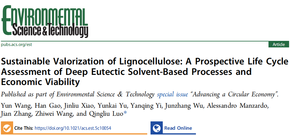 王双飞院士团队罗青柳博士课题组在木质纤维素可持续增值领域取得重要进展。相关研究成果以“Sustainable Valorization of Lignocellulose: A Prospective Life Cycle Assessment of Deep Eutectic Solvent-Based Processes and Economic Viability”为题,发表于环境科学与技术领域顶级期刊、美国化学学会(ACS)旗下旗舰期刊《Environmental Science & Technology》,该期刊以其严格的审稿标准和对原创性、高水平研究的追求而闻名于世。在此顶刊上发表研究成果,标志着该工作的创新性、严谨性与潜在行业影响力获得了国际权威学界的高度认可。