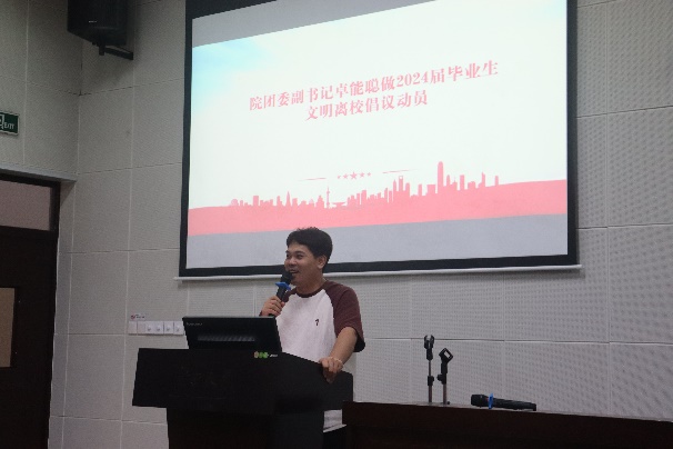 在文明离校倡议环节,院团委副书记卓能聪发言。他强调了遵守学校管理规定的重要性,并呼吁大家要文明离校,保持宿舍卫生、注意聚餐安全、防范诈骗等。同时,他还特别提醒本科生要在系统中提交毕业设计材料,确保学术诚信。