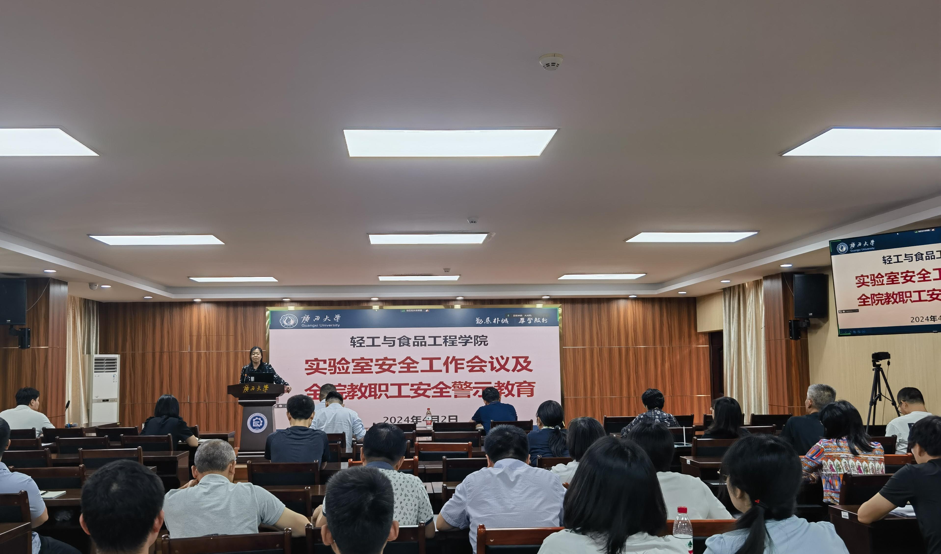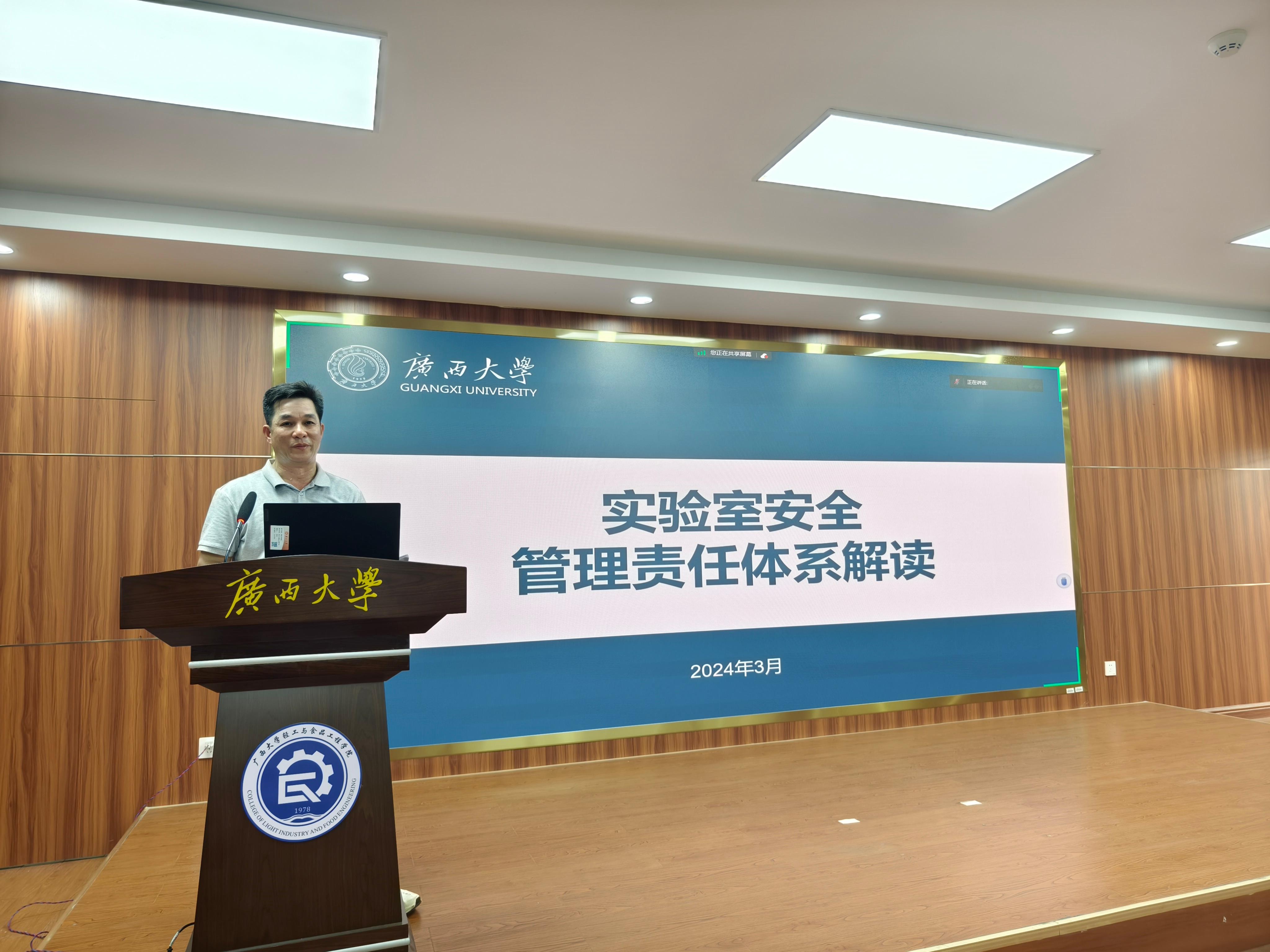 于2024年4月2日下午组织召开了全体教职工参加的实验室安全工作会议,对全院教职工进行安全警示教育,布置全院实验室安全隐患排查和整改工作,并邀请国实处甘正华副处长做“实验室安全管理责任体系解读”专题报告。学院党委书记姜玮主持会议,院长覃程荣及全体领导班子成员出席会议,全院教职工参会。