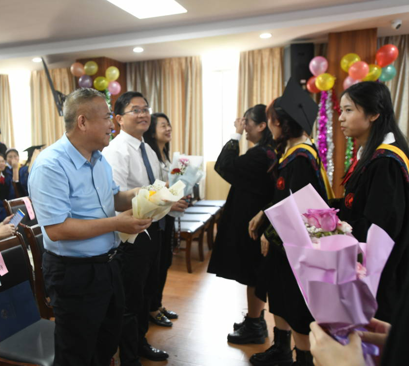 覃程荣与毕业生们温情道别。他说,学院留下了你们成长的轨迹,你们也见证了学院日新月异的发展变化,感谢你们对学院发展建设的支持和贡献!在你们当中,有88名同学选择继续深造,读研或者读博;大部分同学即将走向工作岗位。在这里,我们真心为大家感到骄傲和自豪!