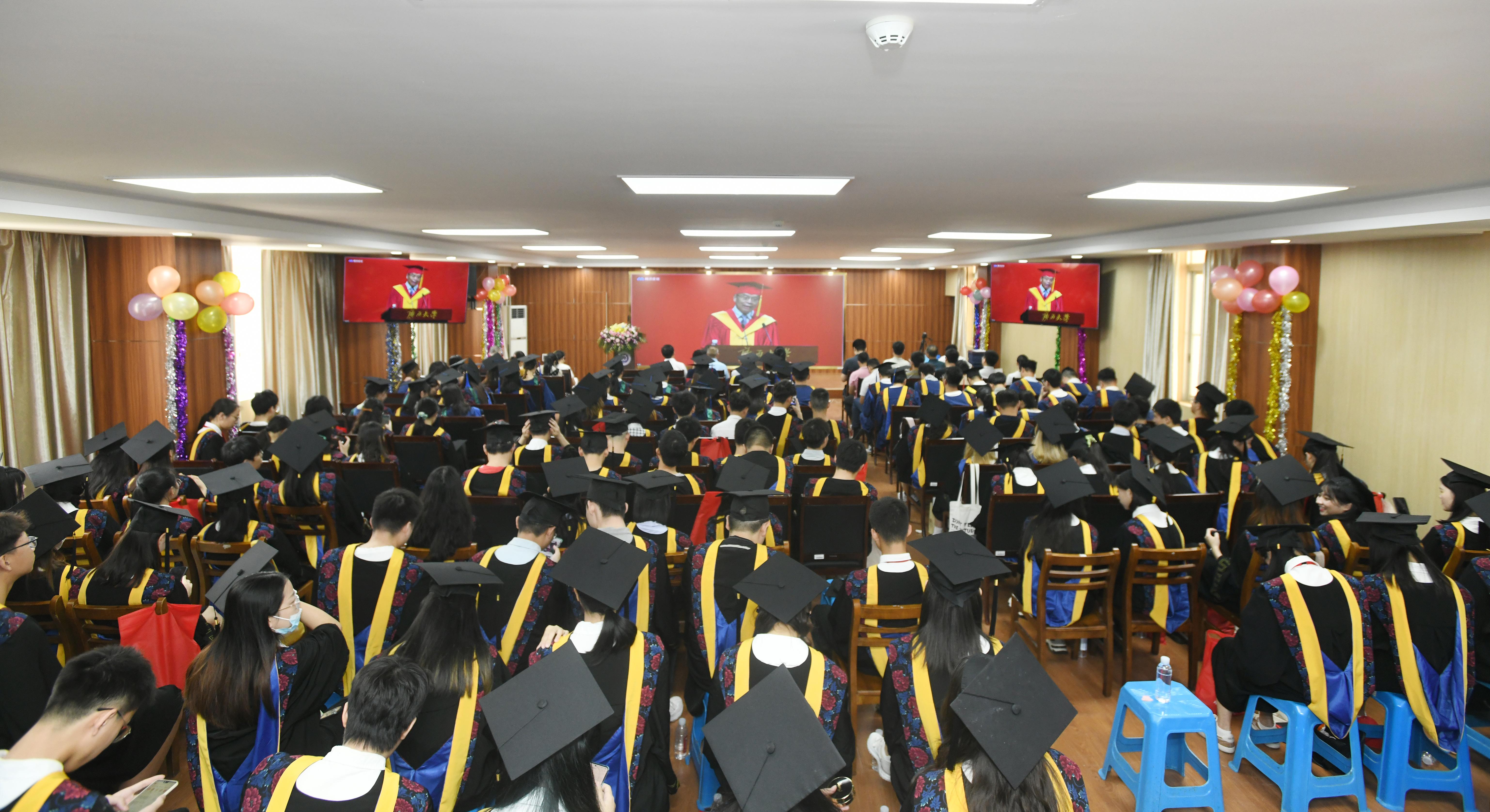 在学院分会场上,大家认真观看学校毕业典礼暨学位授予仪式直播。