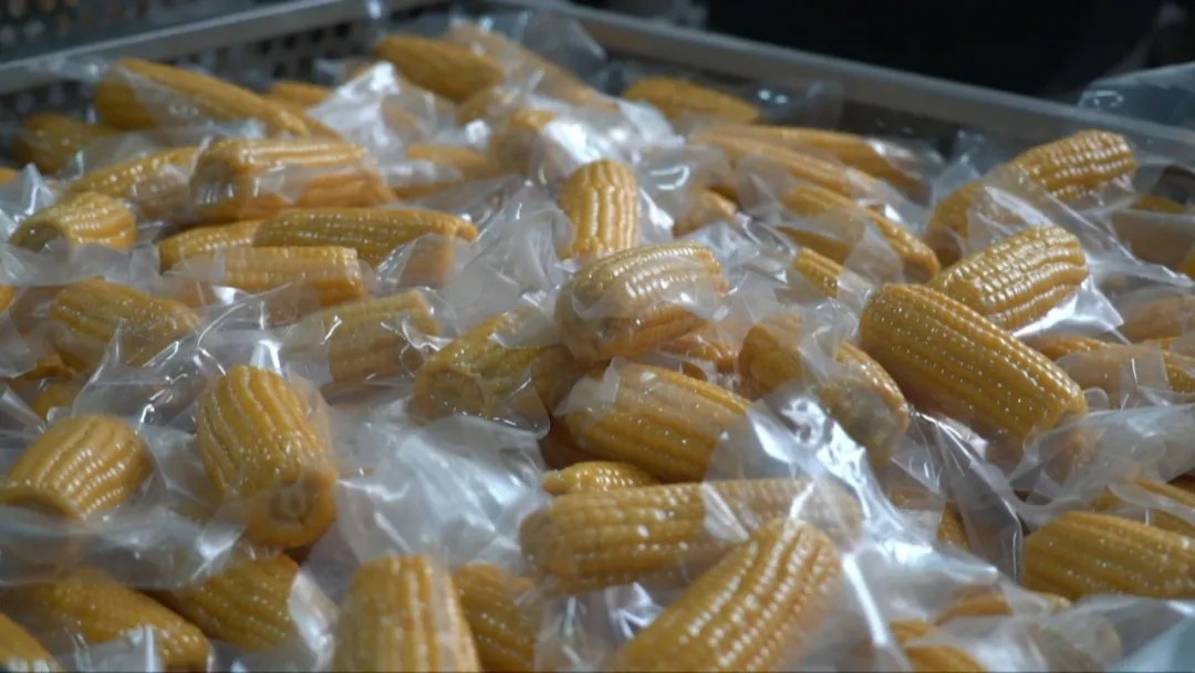 广西新闻频道记者 谭丽娜:现在我手上的两个玉米,这是新鲜现煮的玉米,这个就是抽了真空包装的玉米,它们看起来现煮的明显更加饱满透亮,但是这个抽真空的玉米也不逊色,它的香气还是挺足的,它的颜色还有弹性各方面看起来都挺好。我刚刚尝了一口,这个玉米如果不说它是抽真空的玉米,其实它的味道和香气跟新鲜现煮的玉米有90%以上的相似度,还是挺好吃的。