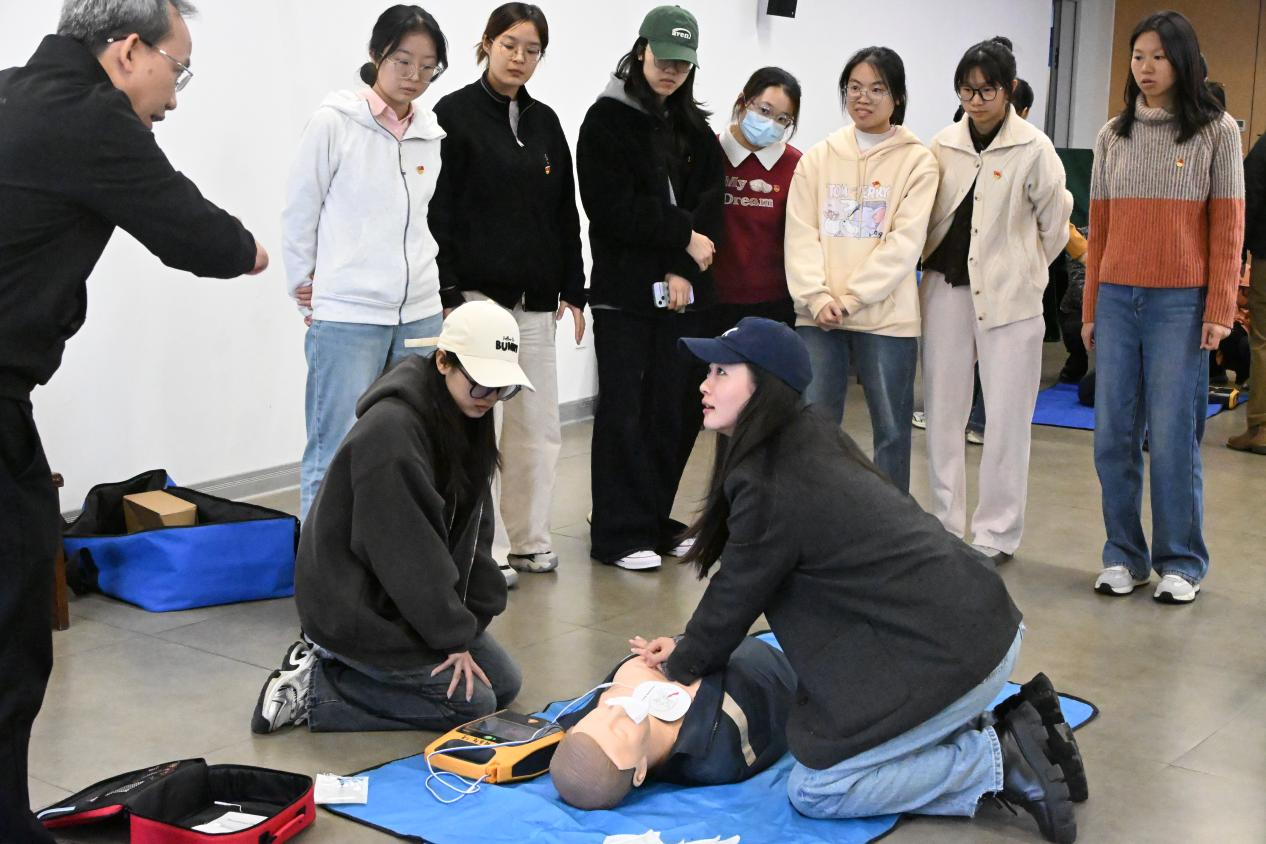 在实操演练环节,校医院的医生们亲自示范操作流程,对关键动作进行细致指导。党员同志们热情高涨,纷纷上前动手实践,讲师逐一纠正操作过程中出现的问题,确保大家能够准确掌握急救技能。