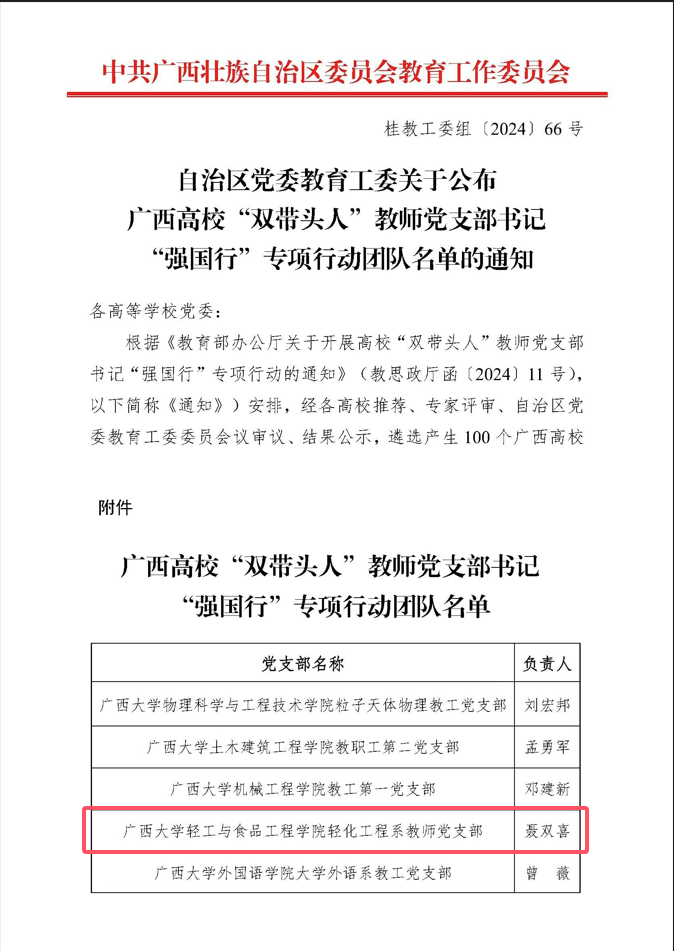 近日,自治区党委教育工委公布了全区高校“双带头人”教师党支部书记“强国行”专项行动团队入选名单,绅士漫画 轻化工程系教师党支部入选广西高校“双带头人”教师党支部书记“强国行”专项行动团队。 “强国行”专项行动是教育部为创新落实立德树人根本任务,充分发挥高校“双带头人”示范引领作用,推进强国建设的重要举措。绅士漫画 党委始终坚持以党建为引领,将党支部建设与教学科研、人才培养等中心工作紧密结合,不断提升教师党建工作的质量,实施“党建+”融合模式,促进党建与业务工作深度融合,全面推动学院高质量发展。