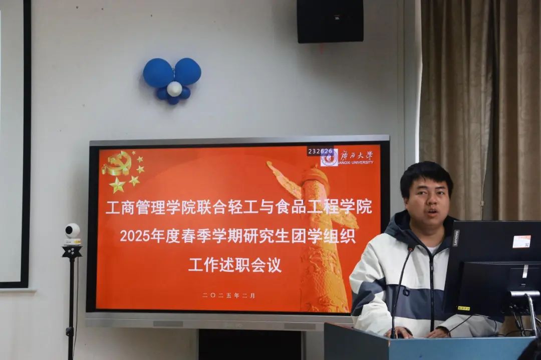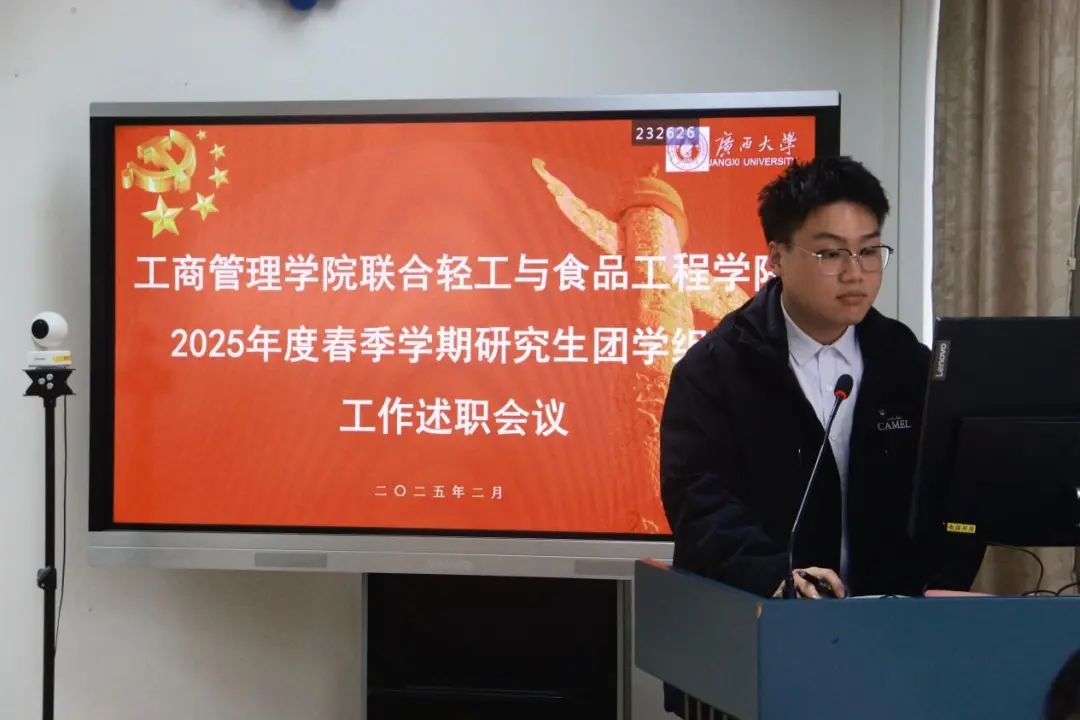 随后,两院研究生团学组织各部门负责人依次述职。工商管理学院党建秘书处、学生团委,以及两院研究生会主席团成员分别汇报工作,涵盖党建、思想引领、团务知识、学术科研、就业服务等方面,以数据和案例总结阶段性成果,并规划未来发展路径。