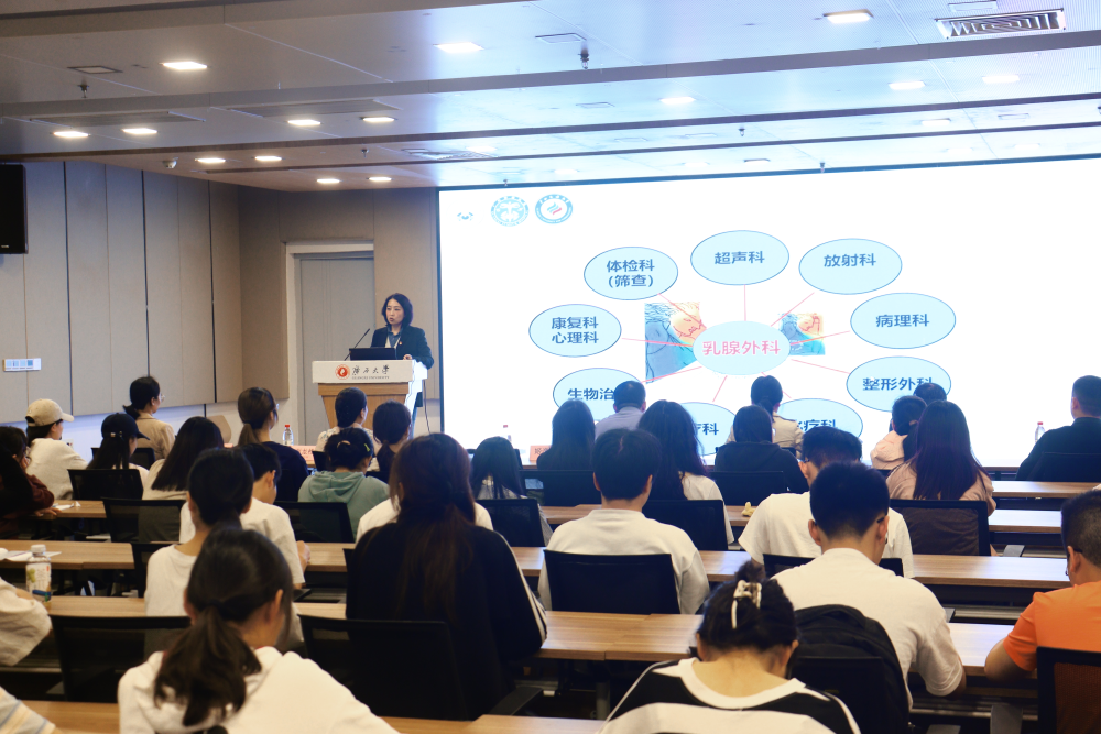 在大学生活动中心三楼会议厅,乳腺外科主任医师姬逸男以“爱乳一生,律动青春”为主题,深入浅出地讲解乳腺疾病的预防、筛查与治疗相关知识。她通过生动的案例与实用的建议,引导现场师生树立正确的健康观念。