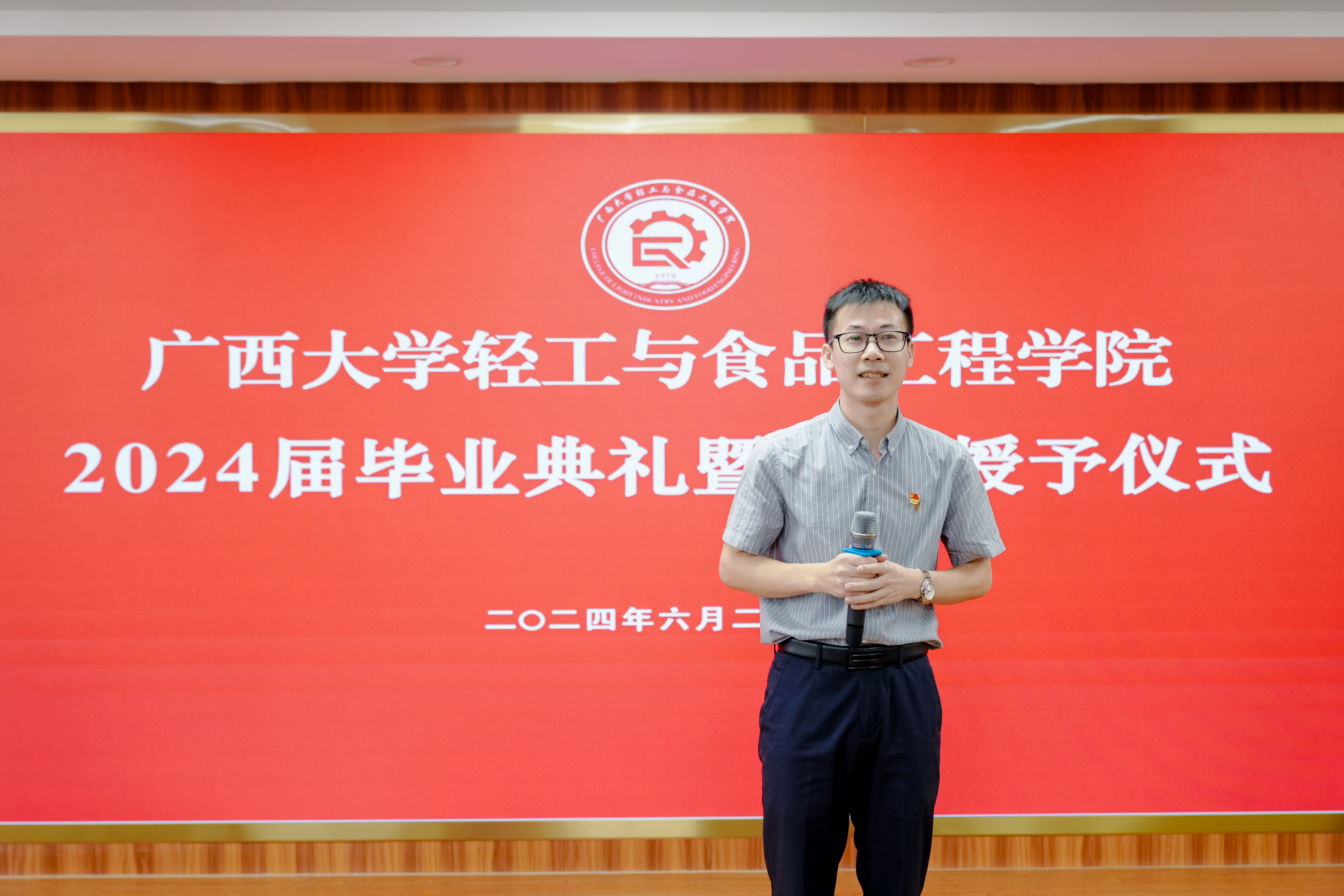 随后,覃程荣院长庄重地为每一位毕业生授予学位,行拨穗礼,并赠予学院徽章。这一刻,不仅象征着毕业生们圆满完成了学业,更预示着他们即将踏上崭新的人生旅程,开启辉煌的未来篇章。