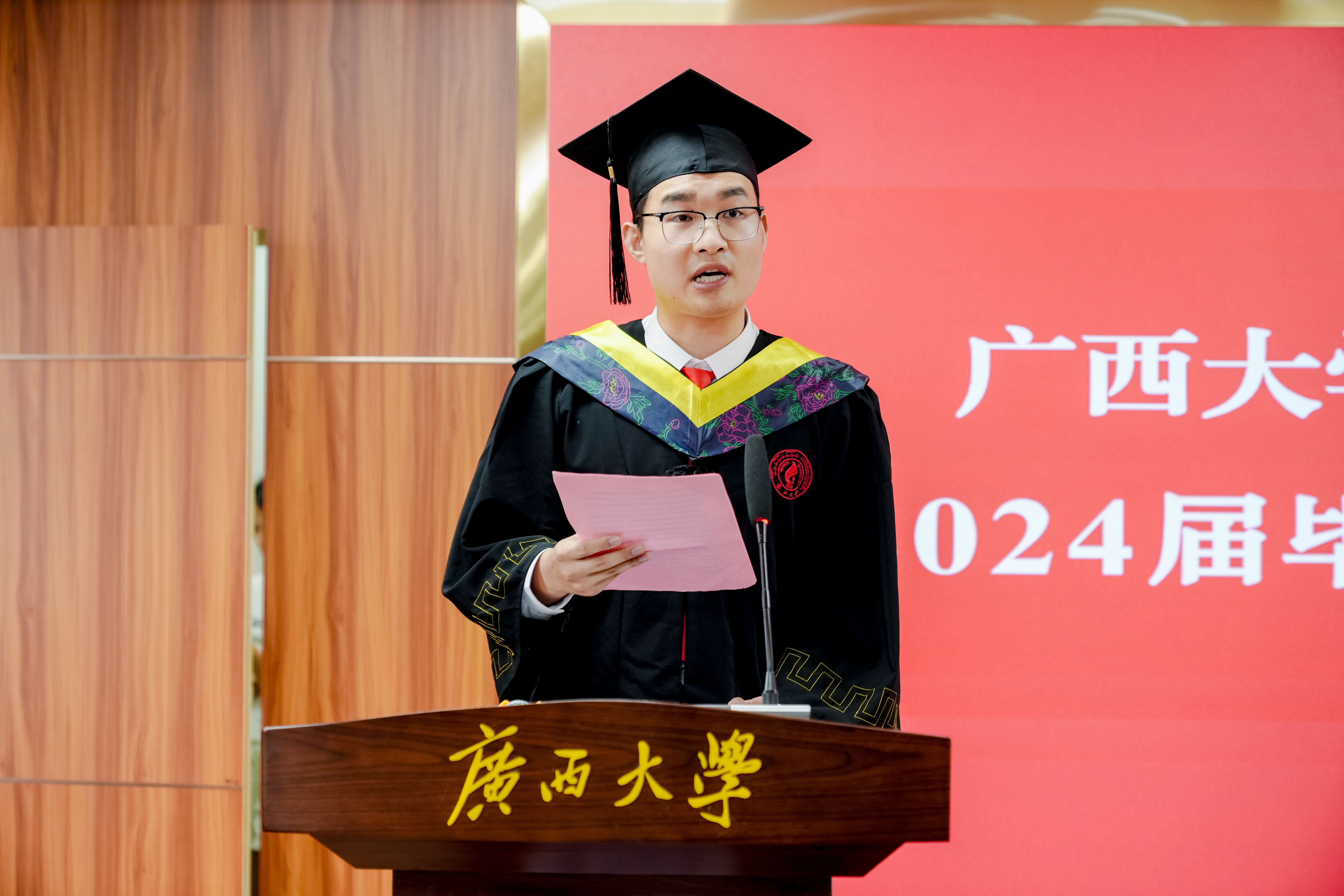 典礼伊始,制糖201班徐龙钊作为毕业生代表发言。他回忆了大学四年难忘的校园生活,号召毕业生们将青春贡献在祖国最需要的地方。他引用习近平总书记对广大青年的寄语“青春由磨砺而出彩,人生因奋斗而升华”,指出作为新时代的青年学子,有责任也有义务肩负起新时代的重任,不负韶华,不负时代、不负人民,成为新时代奋勇前进的先锋。未来将带着母校的期望,老师们的教诲,同学之间的鼓励,砥砺前行,以青春之名,赴时代之约。