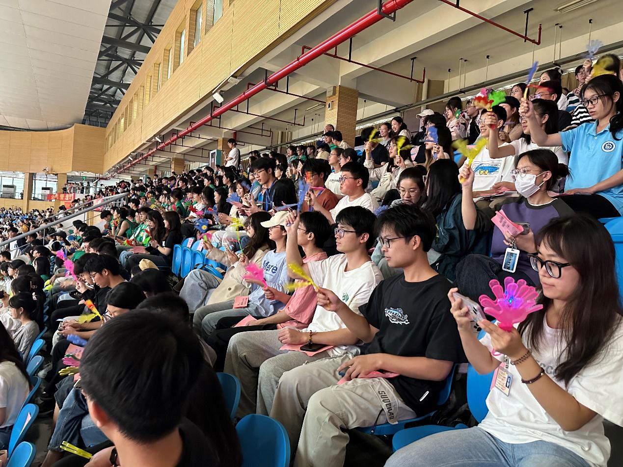 观众早早来到观众席为参赛队员加油助威,院旗在响亮的鼓声、掌声、呐喊声中热烈地舞动着。大家富有激情地呐喊道:“灵动轻工,谁与争锋;赛场雄风,舞动轻工”。大家对各个代表队的精彩表演翘首以盼,现场的气氛十分热烈。