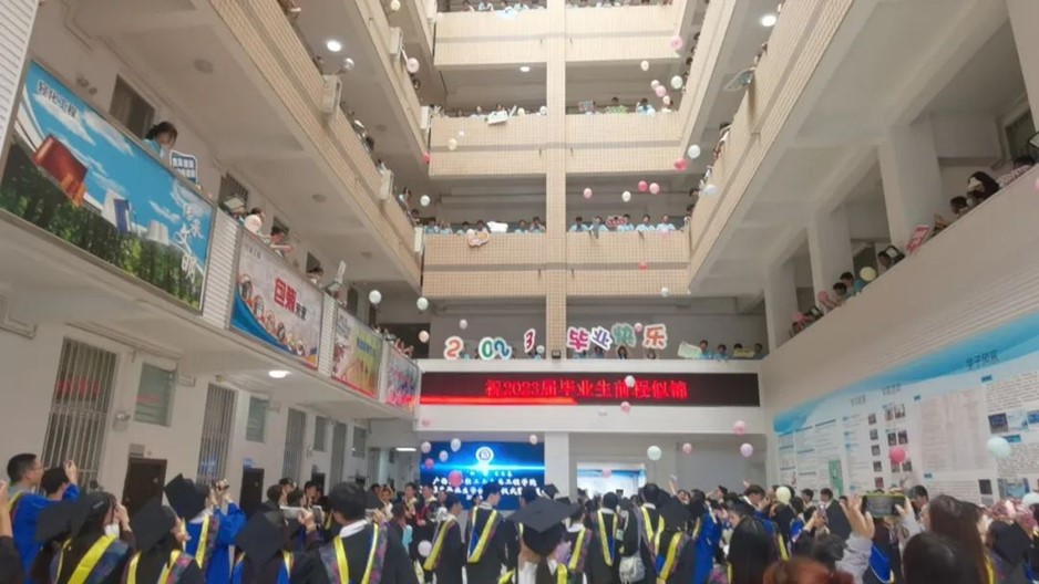 学院师生在毕业生入场前拿着五彩缤纷的气球到每一楼层的走廊迎接毕业生们的到来,学弟学妹们手持毕业寄语花束在学院门前迎接每一位毕业生的到来,并为每一位毕业生献上带有学院真挚祝福的贺卡与小花束,为学长学姐们送上专属于他们的毕业祝福。学院大厅里,随着毕业生们的陆续到来,活动预热歌会也激情展开。学院声乐队的同学们演唱着一首首青春歌曲带动现场氛围,毕业生们在学院大厅里欢快合唱、互道离别、合影留念。当最后一首歌响起时,学弟学妹们提前准备的气球从楼上纷纷落下,将预热歌会推向高潮。至此,全体毕业生转至学院604参加2023届毕业生学位授予仪式暨毕业欢送会。