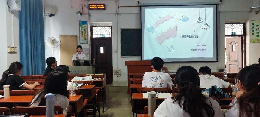 录取的轻化工程191班李佳蔚和被华中农业大学录取的食品质量与安全191班宁冀阳,给同学们分享了相关专业的院校选择、学习规划、笔试科目复习、面试、备考过程的心态调整,以及每个时期遇到困难、解决办法和心得体会。在自由交流环节,三位同学耐心回答了学弟学妹们的提问。