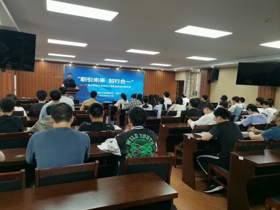 择社所需,择己所长!为深入贯彻落实《关于开展2023届高校毕业生春季促就业攻坚行动的通知》精神和学校就业工作要求,引导学生树立正确的成才观、职业观、就业观,西大轻工学院于4月14日开展企业高管“进轻工导求职”就业育人系列主题教育活动,为毕业生提供个性化就业指导和服务。本场活动由华劲集团股份有限公司人力资源副总裁武鹏飞先生到学院开展。学院党委副书记唐旭彬、轻化工程系副主任沙九龙、轻化工程班主任代表、专业课教师代表、负责就业工作辅导员以及轻化工程专业大三、大四学生及研究生代表参加活动。