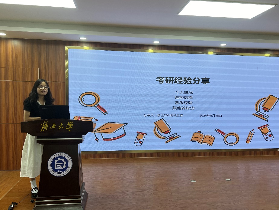 优秀共青团员”等荣誉称号。他向大家介绍了考研前期一系列的复习方法,以及复试面试的小技巧,最后向大家强调了调整心态的重要性。