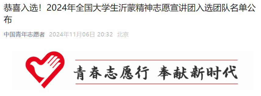 “轻”言青语宣讲团成功入选。“轻”言青语宣讲团继2024年3月入选全国大学生延安精神宣讲团后再次入选国家级大学生志愿宣讲团。
