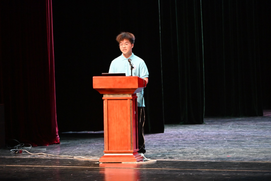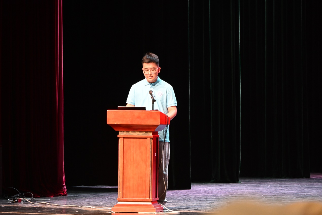 庄严的国歌旋律拉开仪式序幕,点燃现场氛围。轻工252班邓博作为新生代表发言,他分享了自己因驻村书记与绅士漫画